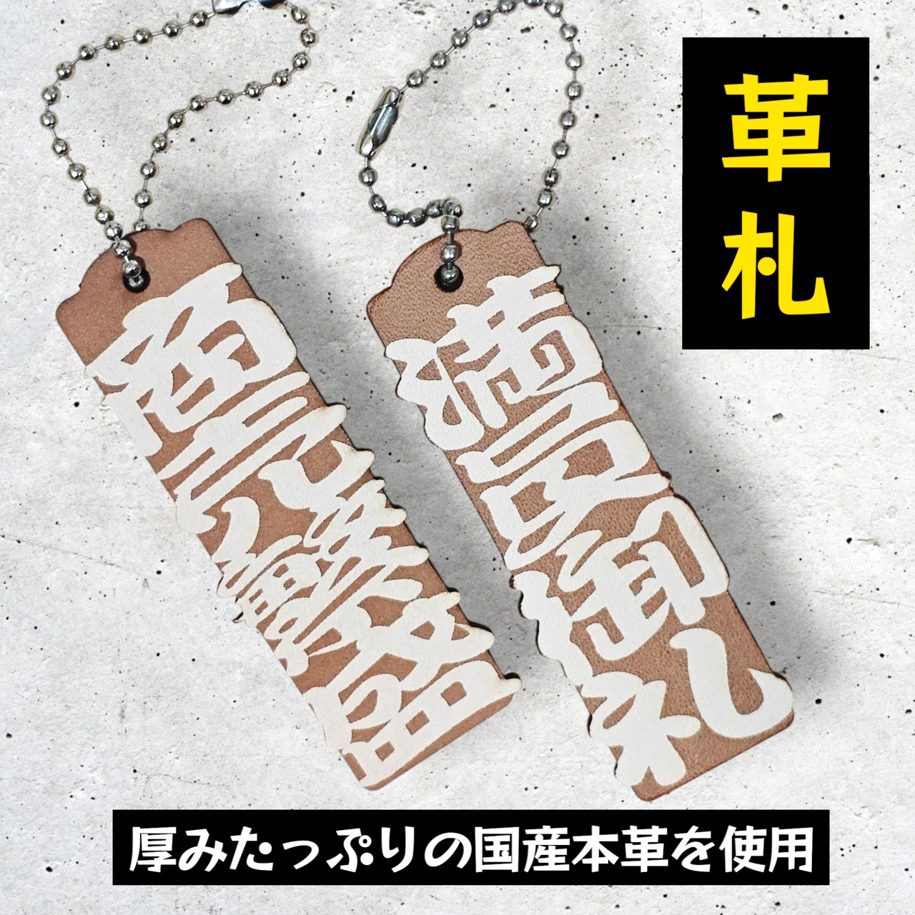 この革札はナチュラル色の国産本革を2枚張り合わせており、片面にお好きな文字を入れることができます。使うほどに味わいが深まる経年変化を楽しむことができます。