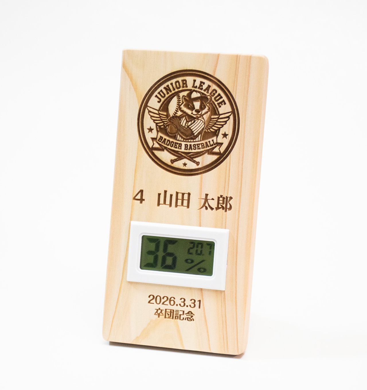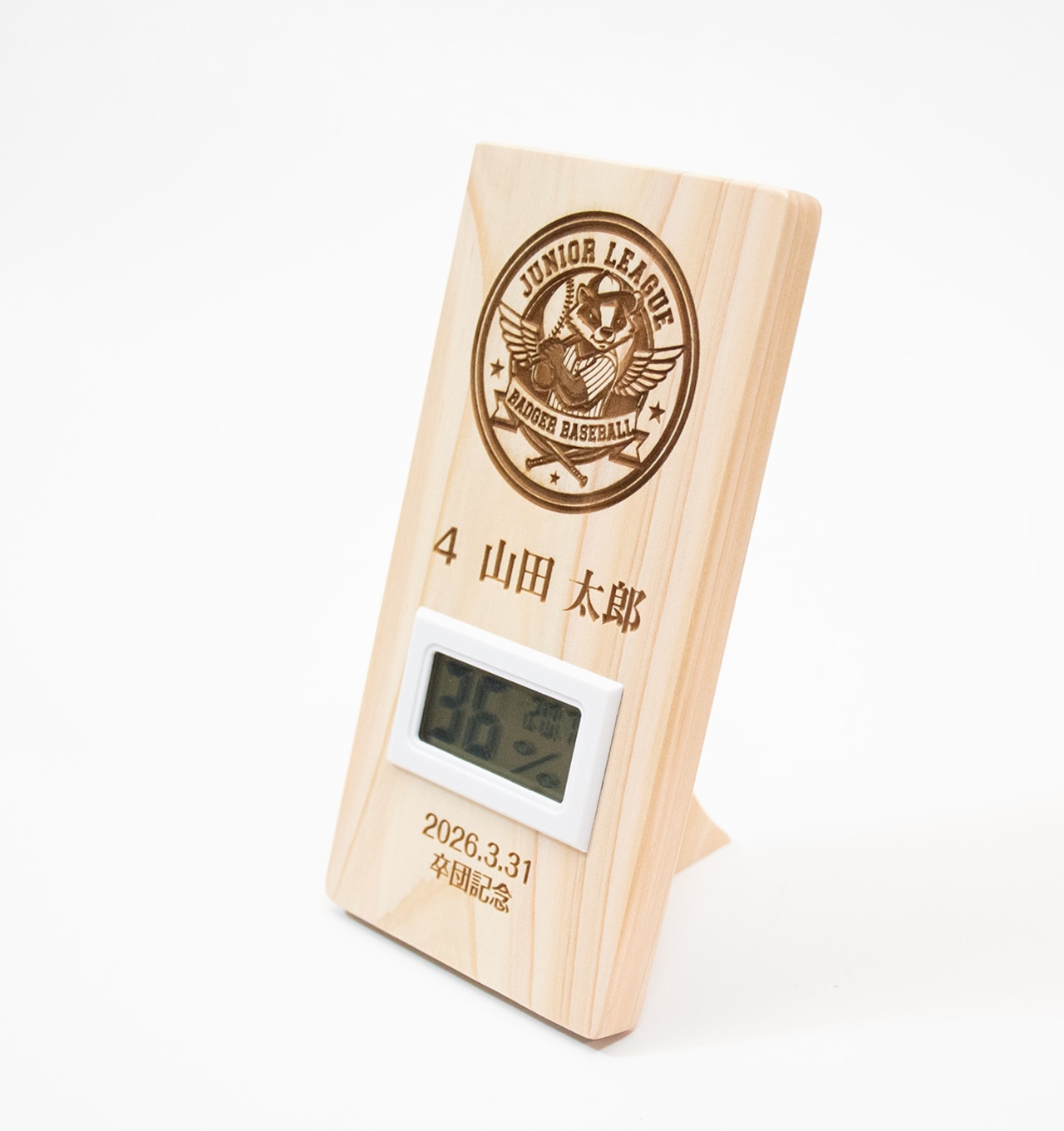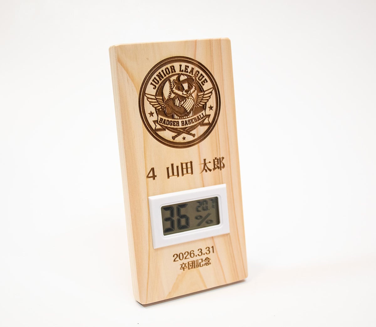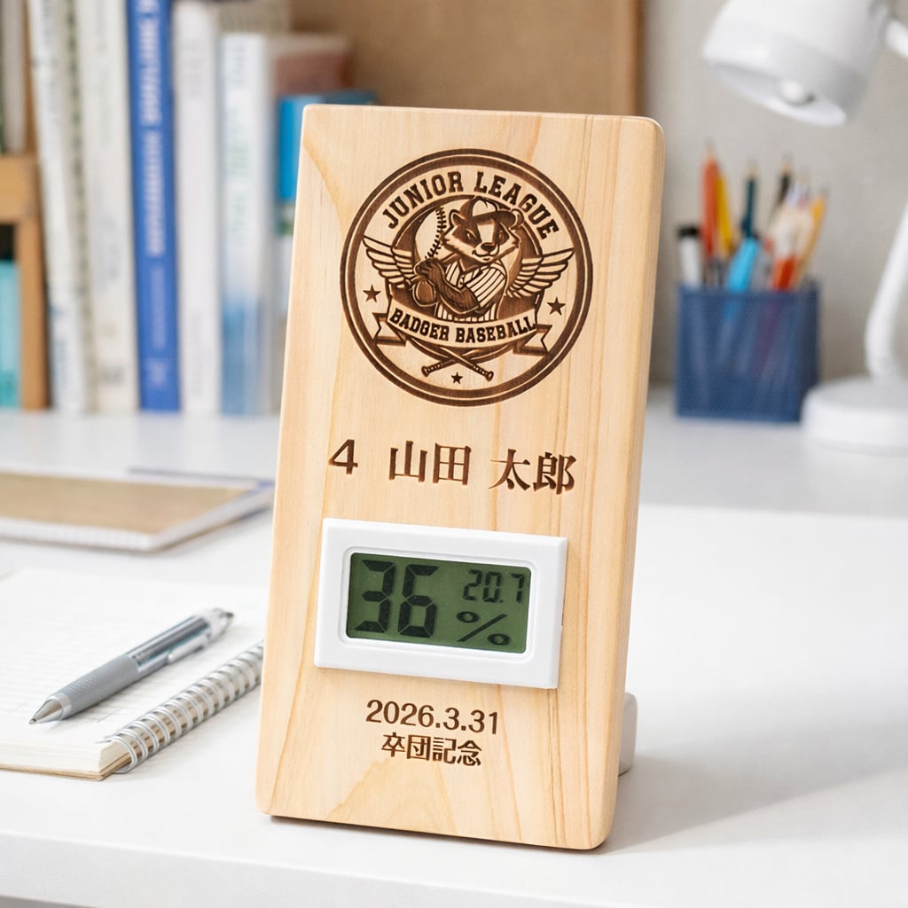 この特別な卒団・卒部記念盾は、心地よい香りのヒノキを使用し、温湿度計が付いた実用性の高いアイテムです。湿度と温度を管理することで、乾燥対策や風邪予防、ヒートショック対策に大変役立ちます。特に受験生のお子様の健康を守る強い味方です。