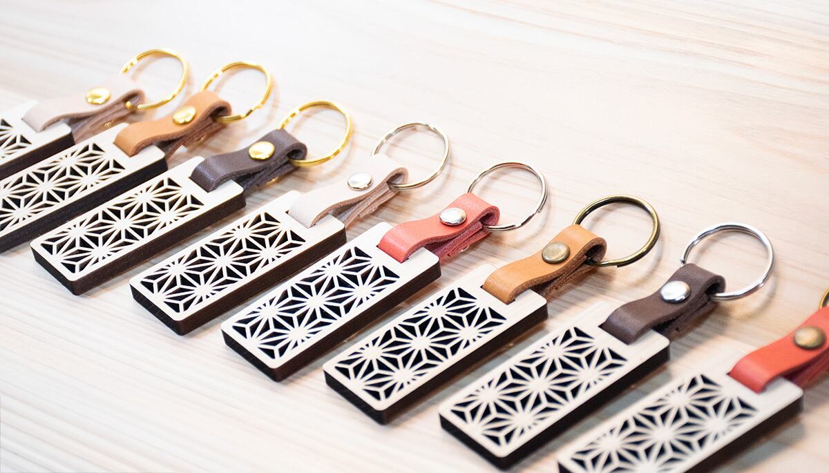目を引く和モダン。本革×ヒノキの「麻の葉」キーホルダー